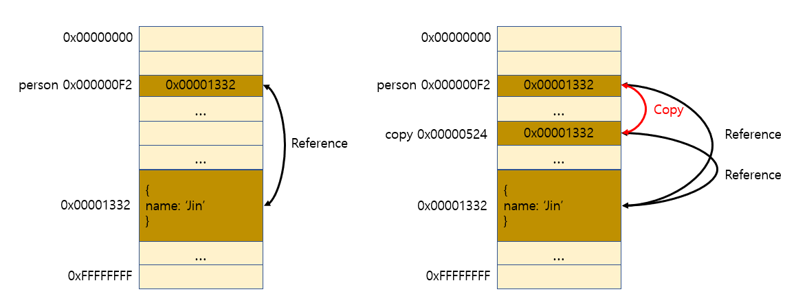 // 참조 값을 복사, person과 copy는 동일한 참조 값을 갖음
