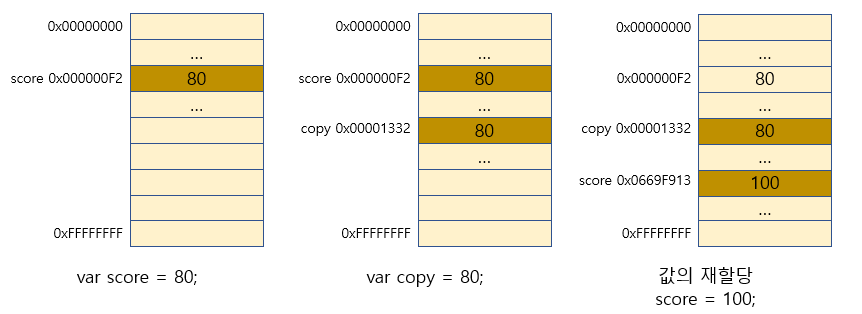 // score 변수와 copy 변수의 값은 다른 메모리 공간에 저장된 별개의 값