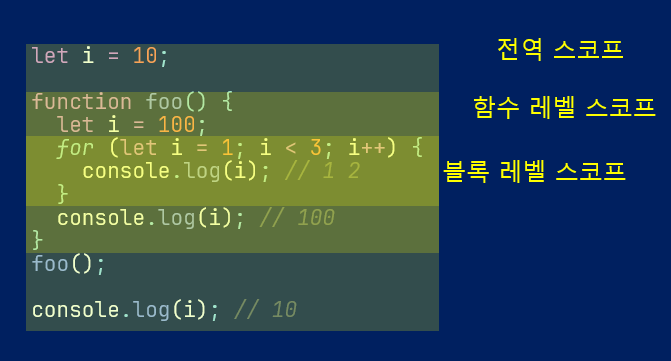 let 키워드로 선언한 변수는 모든 코드 블록 (함수, if 문, for문, while문, try/catch 문 등)을 지역 스코프로 인정하는 블록 레벨 스코프 block-level scope를 따름