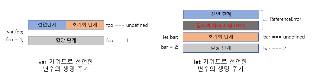 let 키워드로 선언한 변수는 "선언 단계"와 "초기화 단계"가 분리되어 진행
