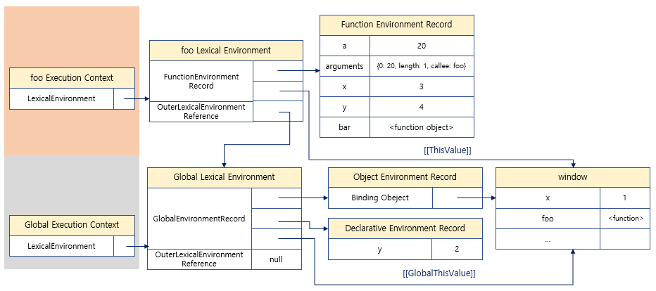 - 렉시컬 환경 lexical environment는 식별자와 식별자에 바인딩된 값, 그리고 상위 스코프에 대한 차몾를 기록하는 자료구조로 실행 컨텍스트르 구성하는 컴포넌트