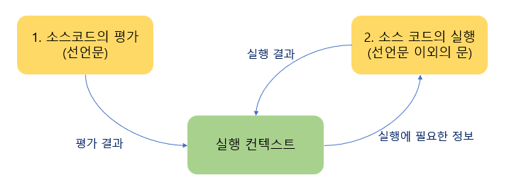 - 자바스크립트는 "소스코드의 평가"와 "소스코드의 실행" 과정으로 나누어 처리