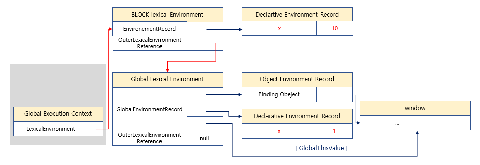 - 이 때 새롭게 생성된 코드 블록을 위한 외부 렉시컬 환경의 외부 렉시컬 환경에 대한 참조는 해당 코드 블록이 실행되기 이전의 전역 렉시컬 환경을 가리킴