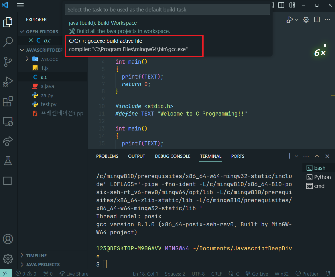 - 상단 툴바 Terminal/Configure Default Build Task -> gcc.exe or g++.exe 선택