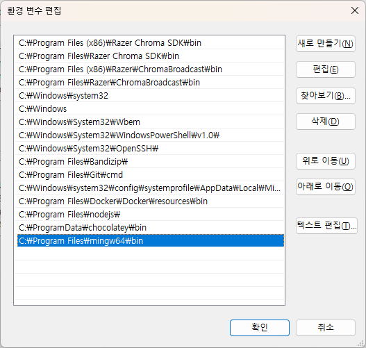 - 시스템 변수의 PATH에 MinGW-w64 폴더를 넣은 경로\bin 경로 추가
