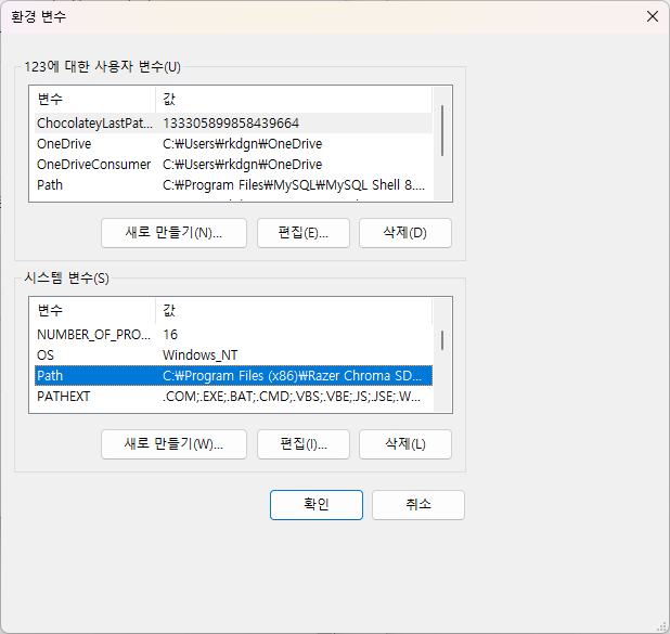 - 시스템 환경 변수/고급/환경 변수