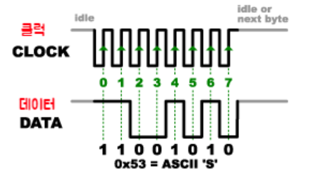 - 동기: master와 slave 간의 동기화 신호인 clock을 사용