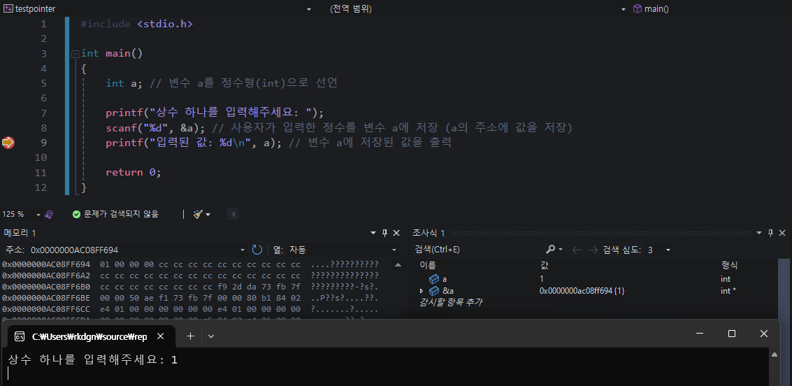 printf("입력된 값: %d\n", *p); // 포인터가 가르키고 있는 값 출력하기