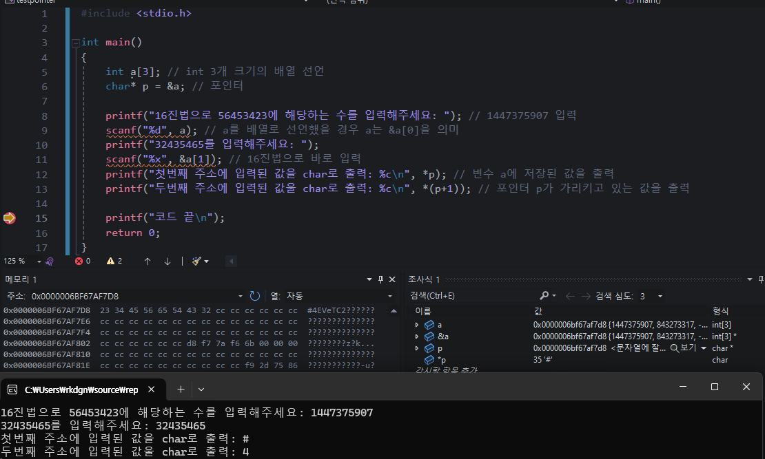printf("첫번째 주소에 입력된 값을 char로 출력: %c\n", *p); // 변수 a에 저장된 값을 출력