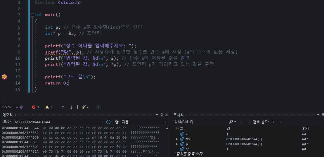 printf("입력된 값: %d\n", *p); // 변수 a에 저장된 값을 출력
