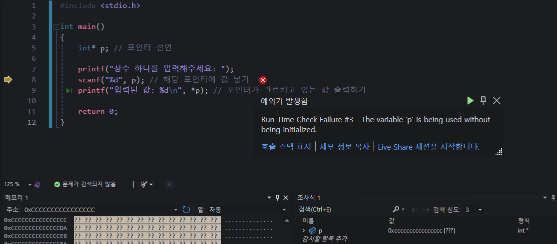 정상적으로 포인터 p가 가르키고 있는 주소에 값이 할당된 것을 확인할 수 있다