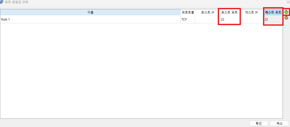 우측에 + 아이콘을 눌러서 항목을 추가하고 호스트포트와 게스트포트에 22를 작성해준다