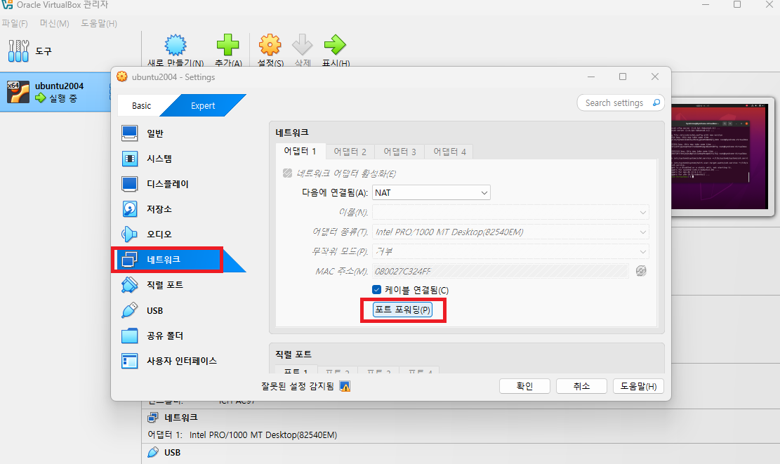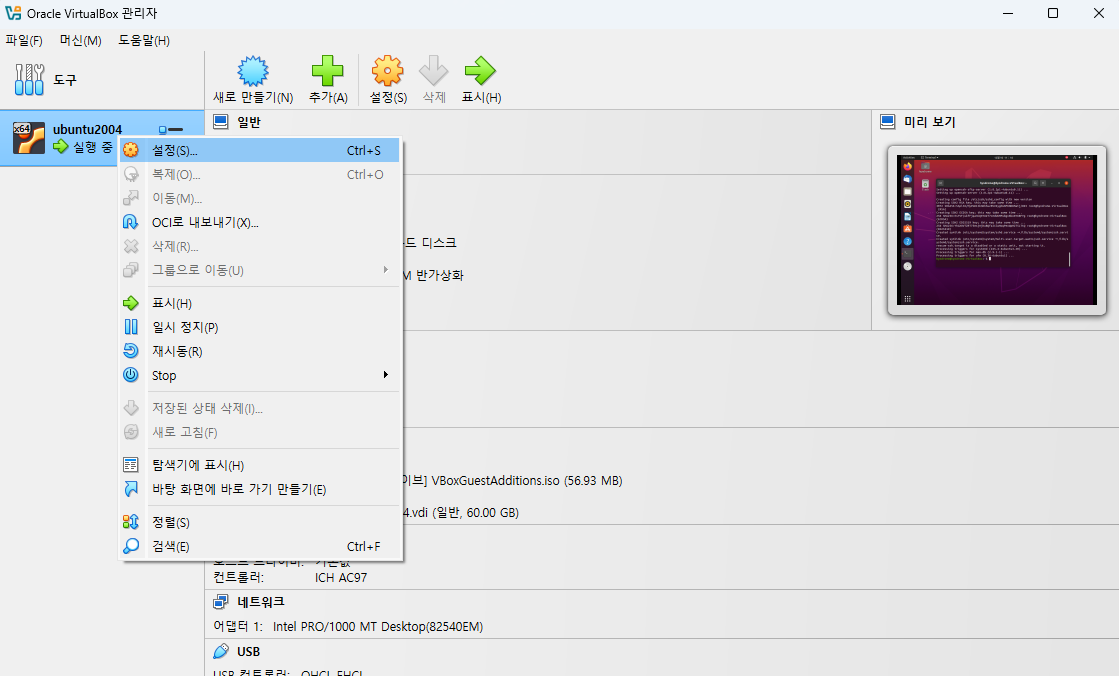 VirtualBox 관리자에서 실행중인 ubuntu2004 우클릭 / 설정