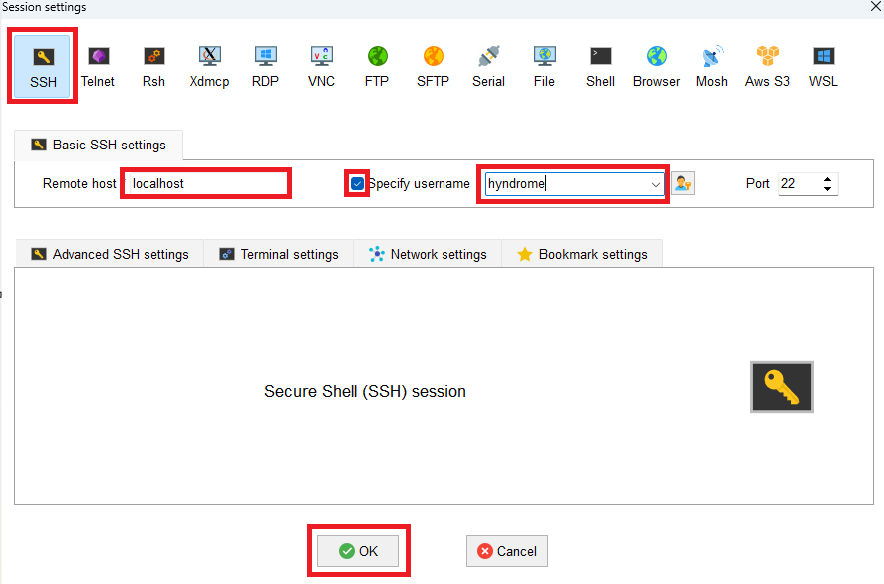 SSH / Remost host: localhost 입력 / Specify username 체크, 우분투 유저 이름 입력 / OK
