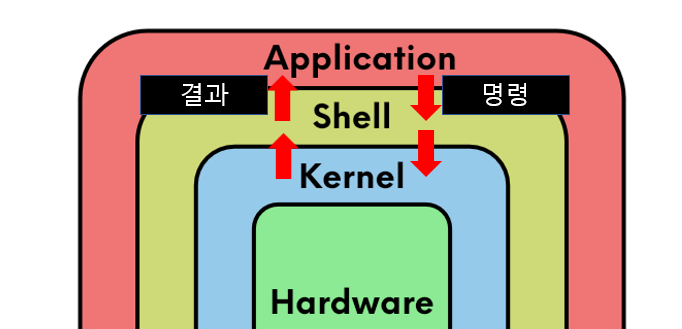 사용자가 Application에서 Kernel 명령을 전달하려면 interface 역할을 하는 Shell을 통해 전달한다.