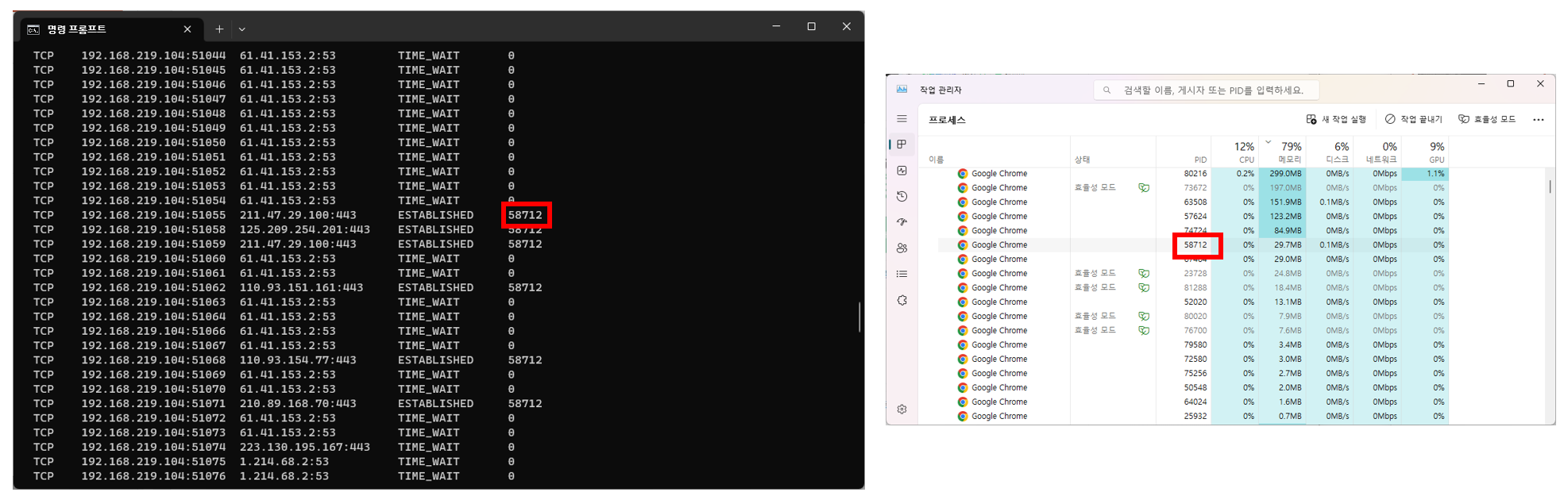 활성 연결 테이블의 PID와 작업 관리자에서 프로그램의 PID 확인해보기