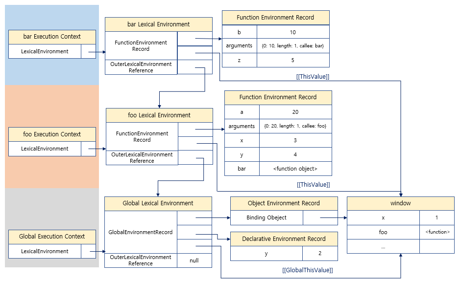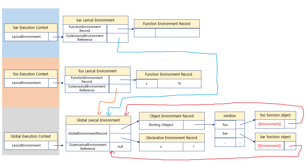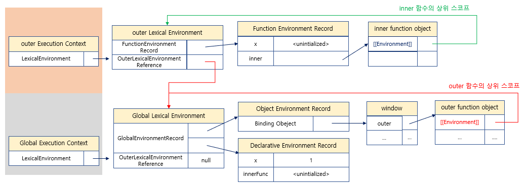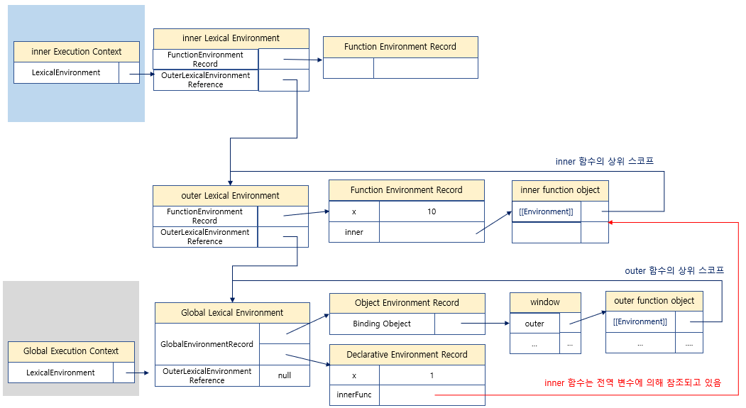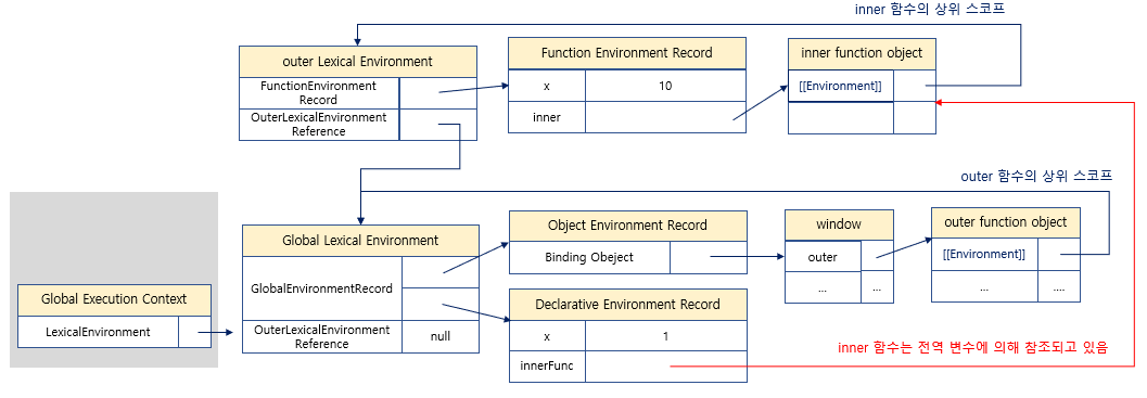 함수는 자신의 내부 슬롯 [[Environment]]에 자신이 정의된 환경, 즉 상위 스코프의 참조를 저장