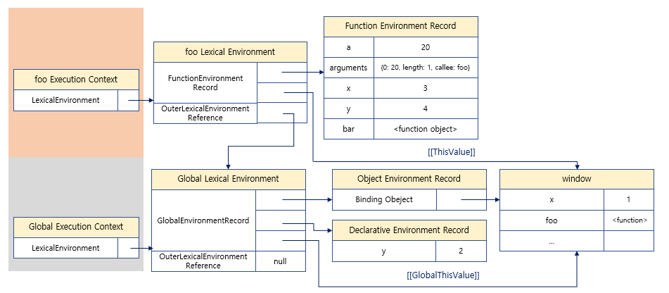 스코프의 실체는 실행 컨텍스트의 렉시컬 환경. 렉시컬 환경은 자신의 외부 렉시컬 환경에 대한 참조 Outer Lexical Environment Reference를 통해 상위 렉시컬 환경과 연결. 이것이 스코프 체인