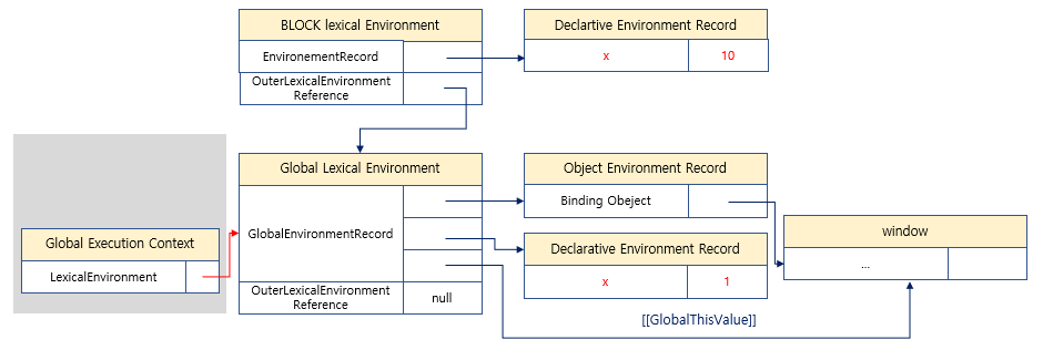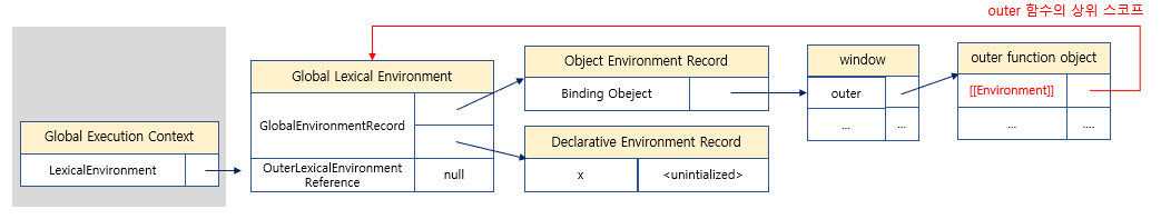 외부 렉시컬 환경에 대한 참조에는 함수 객체의 내부 슬롯 [[Environment]]에 저장된 렉시컬 환경의 참조가 할당 됨