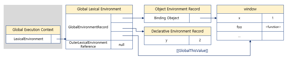 렉시컬 스코프: 렉시컬 환경의 "외부 렉시컬 환경에 대한 참조"에 저장할 참조값. 즉 상위 스코프에 대한 참조는 함수 정의가 평가되는 시점에 함수가 정의된 환경(위치)에 의해 결정