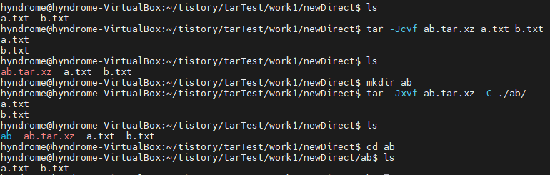- tar는 자동으로 디렉토리를 만들어주는 기능이 없어서 해당 디렉토리를 만들어야 함