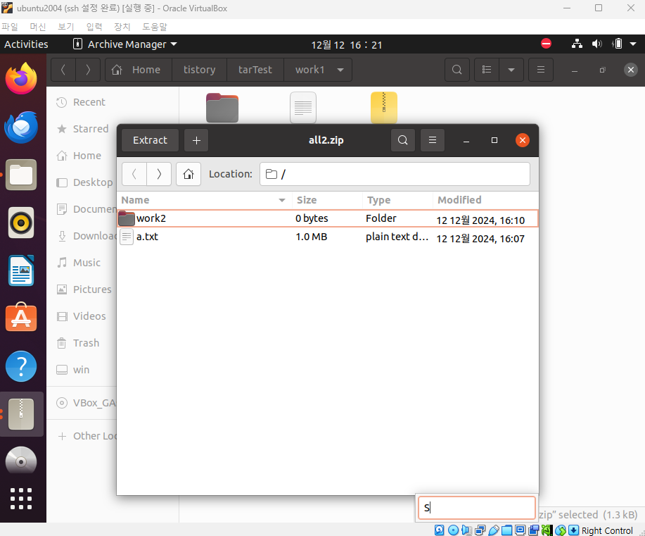 압축 파일 내 work2 디렉토리가 비어있는 파일인 것을 확인할 수 있다