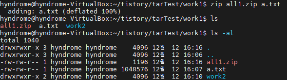 all1.zip을 지우고 a.txt와 work2를 같이 압축해보자.