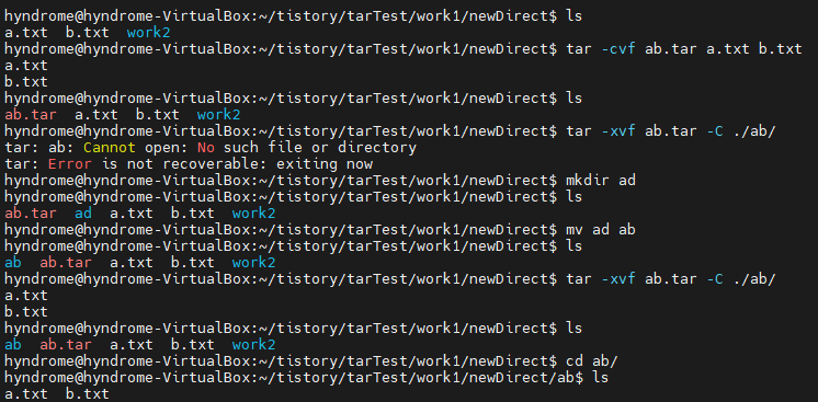 - tar는 자동으로 디렉토리를 만들어주는 기능이 없어서 해당 디렉토리를 만들어야 함